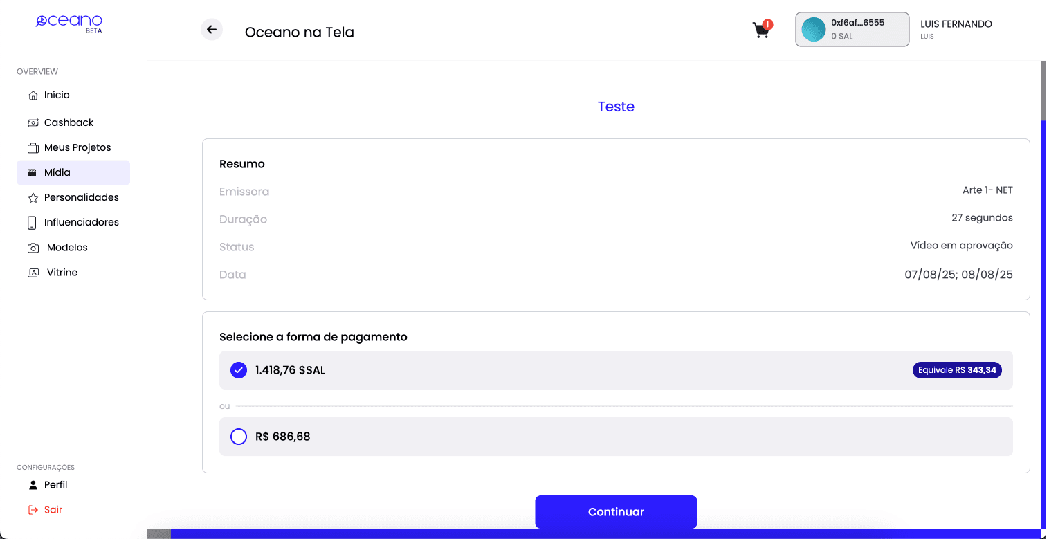 Nessa tela você tem as informações dos valores. Além de verificar o desconto do pagamento em $SAL, nosso utility token. Para saber mais sobre descontos com $SAL, clique aqui.